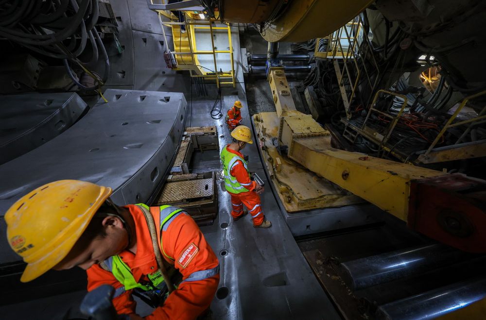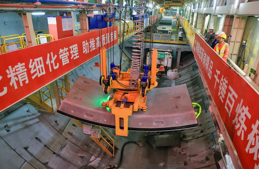 3月12日,中铁十一局施工人员在隧道内进行管片吊运作业。3月12日,中铁十一局施工人员在隧道内进行管片吊运作业。3月12日,中铁十一局施工人员在隧道内进行管片拼装作业。3月12日,中铁十一局技术人员检查“深莞七号(鲲鹏号)”盾构机的螺旋机。