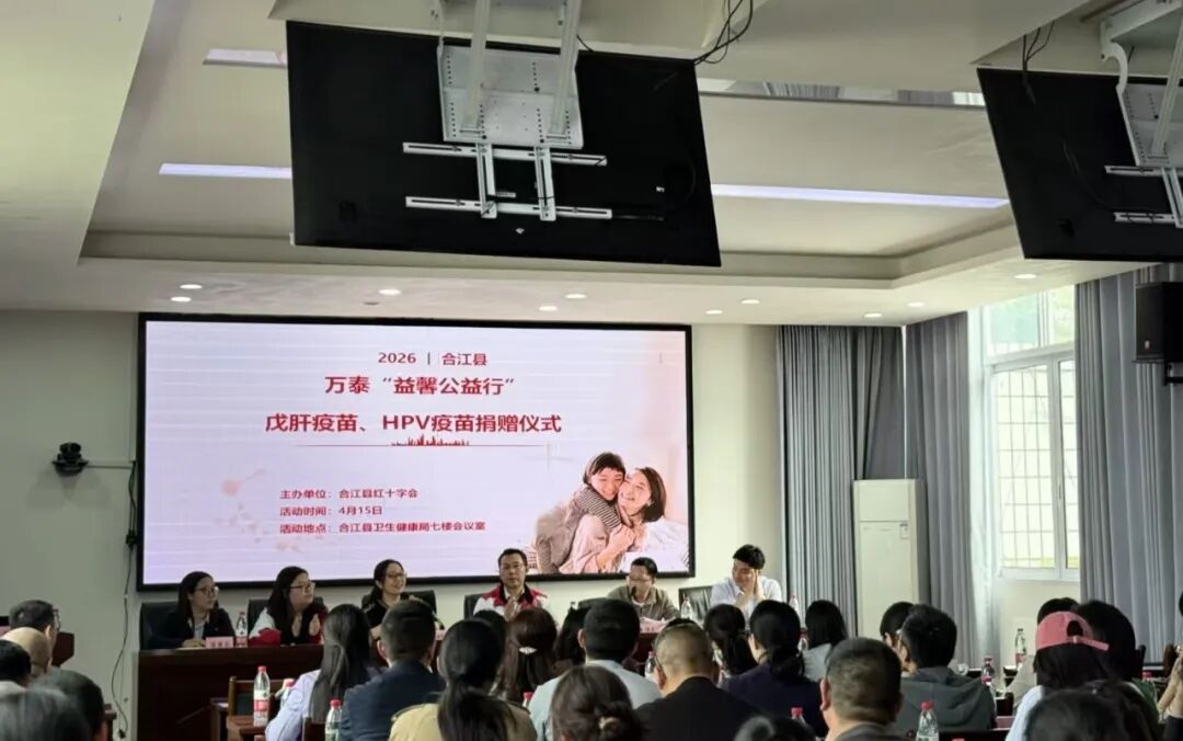 4月15日,由合江县妇联、县红十字会、县卫生健康局、县教育体育局联合开展的2026年“万泰益馨公益行”疫苗捐赠活动在县卫生健康局七楼会议室举行,各镇(街道)妇联、卫生院、中学相关负责人参加活动,县妇联、县红十字会、县教育体育局、县卫生健康局、县疾控中心领导出席活动。