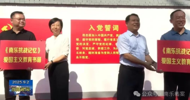 9月2日,南乐县在千口镇武联防抗日旧址开展“铭记历史 缅怀先烈 珍爱和平 开创未来”纪念中国人民抗日战争暨世界反法西斯战争胜利80周年爱国主义教育活动,举行《南乐抗战记忆》图书捐赠仪式。县委副书记孙丽君,县委常委、宣传部部长、副县长陈志广分别为千口镇、教育局捐赠图书。
