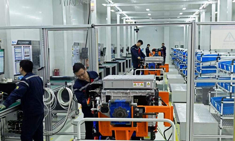 中原内配集团公司氢燃料电池发动机生产线,工人在进行装配作业。