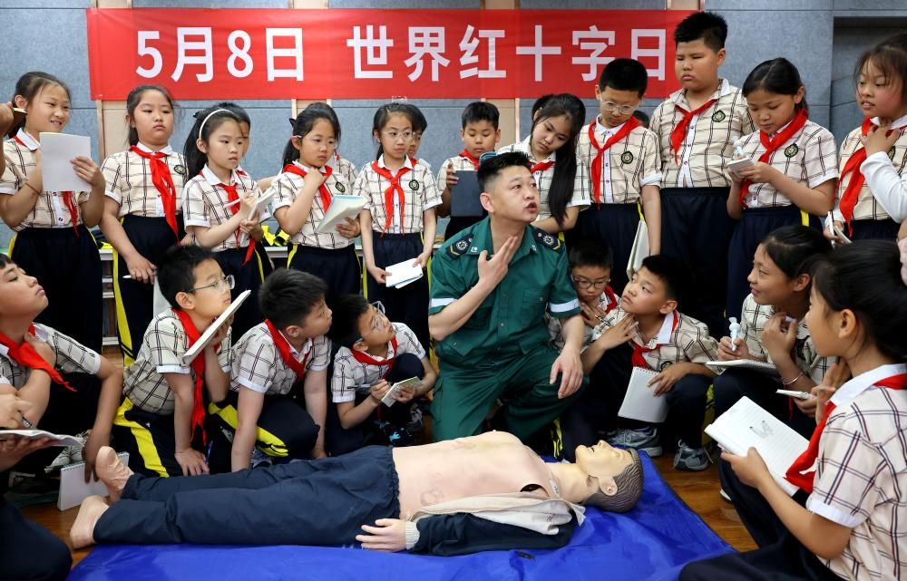 5月7日,在山东省枣庄市市中区文化路小学,医务人员为学生讲解心肺复苏急救知识。 世界红十字日将至,各地开展形式多样的活动,普及急救知识、提升应急救护能力。 新华社发(孙中喆摄)