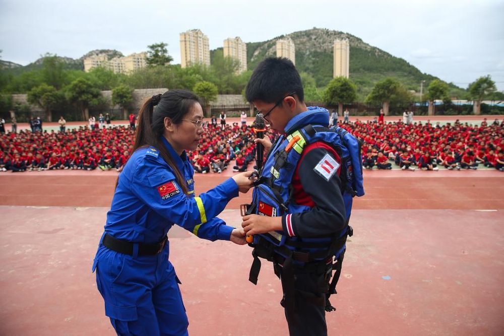 5月9日,在山东省济南市泉海小学,蓝天救援队志愿者给学生讲解、演示救援服穿法。 5月12日是第17个全国防灾减灾日。近日来,各地开展形式多样的防灾减灾宣传教育及演练培训活动,提高人们科学防灾意识和灾害避险自救能力。 新华社发(郝鑫城摄)