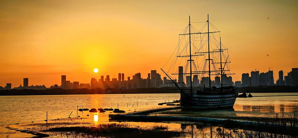 10月22日,湖北省武汉市的东湖风景区在夕阳和晚霞的映衬下,壮美如画。新华社记者 沈虹冰 摄