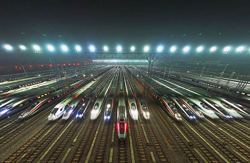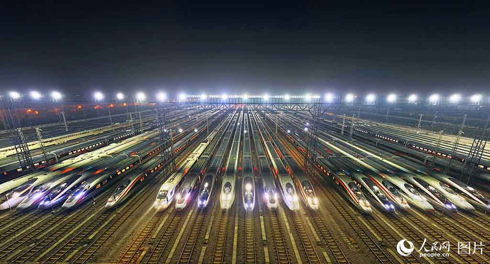 1月24日凌晨,华中地区最大的动车检修基地——武汉动车段,一列列检修后的动车组在铁轨上整齐排列,如“万箭齐发”,又似“陆地舰队”,即将奔驰在祖国广袤的大地上,迎接旅客回家团圆。人民网记者 雷声摄